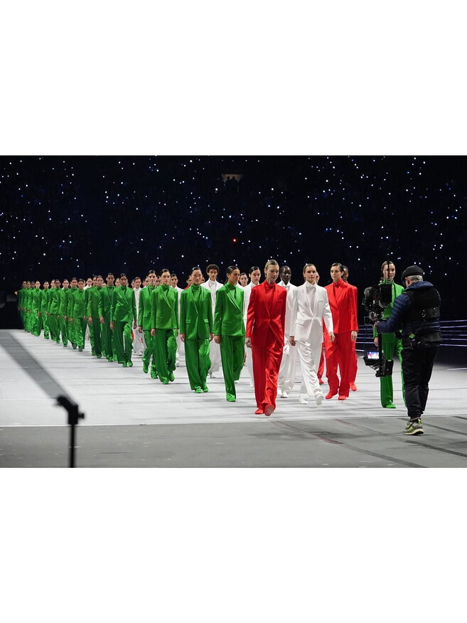 E l’omaggio è stato per lo stilista Giorgio Armani, scomparso il 4 settembre all’età di 91 anni che con Ea7 ha sponsorizzato tutte le divise olimpiche e paralimpiche. Armani era stato coinvolto in prima persona alla progettazione della cerimonia, contribuendo alla definizione del concept e “disegnando” l’ingresso delle due bandiere. Un contributo suddiviso in varie fasi, la prima delle quali è stata la consegna del vessillo al picchetto d’onore. Sessanta modelle, vestite con eleganti completi pantalone monocromatici Giorgio Armani nei colori della bandiera nazionale, suddivise in tre gruppi, hanno sfilato precedendo la portabandiera, Vittoria Ceretti incantevole nel suo abito lungo bianco realizzato su misura.